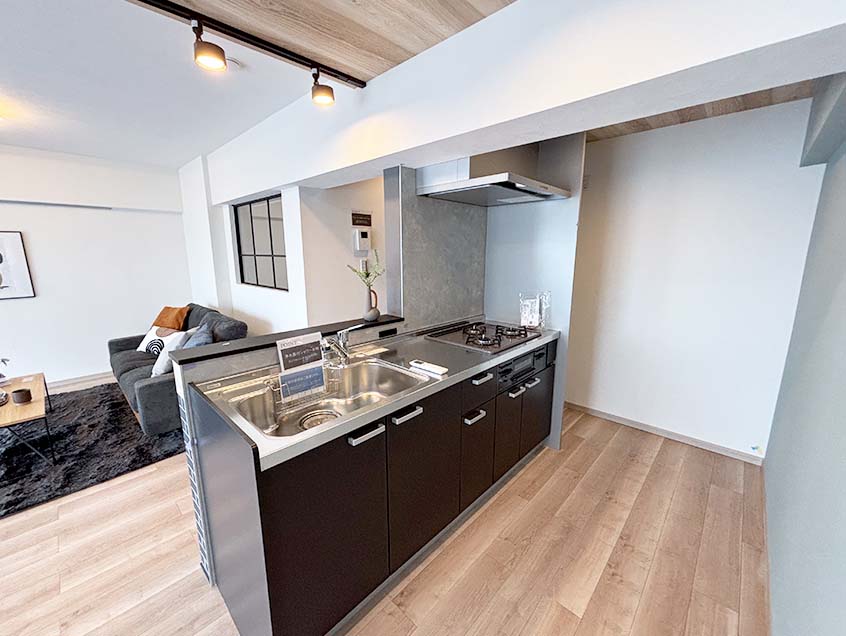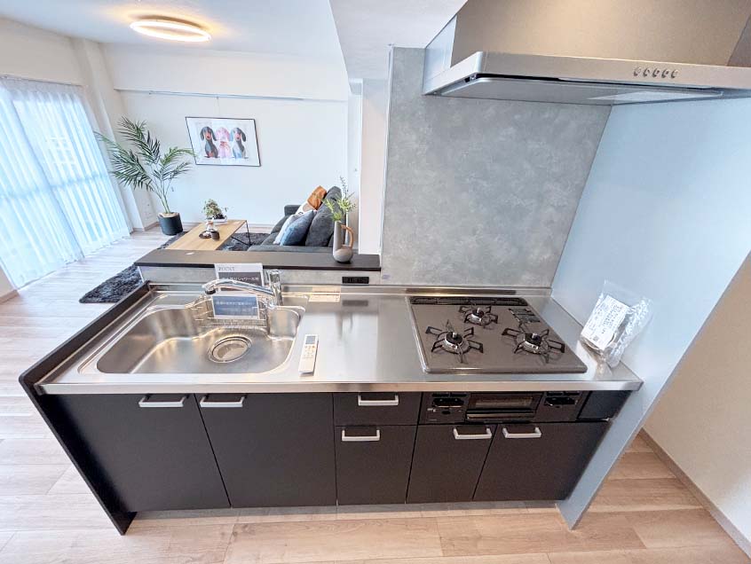 浄水器付き水栓、三つ口コンロ完備のキッチン