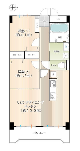 - LDK(約15帖)・洋室1(約4.1帖)・洋室2(約4.5帖)