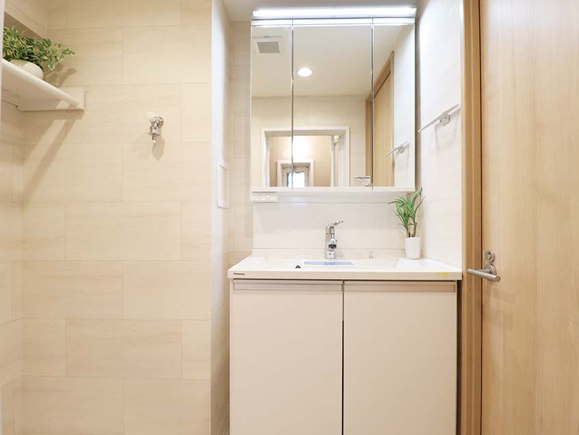 裏側収納付き三面鏡、シャワー水栓完備の使い勝手の良い洗面台