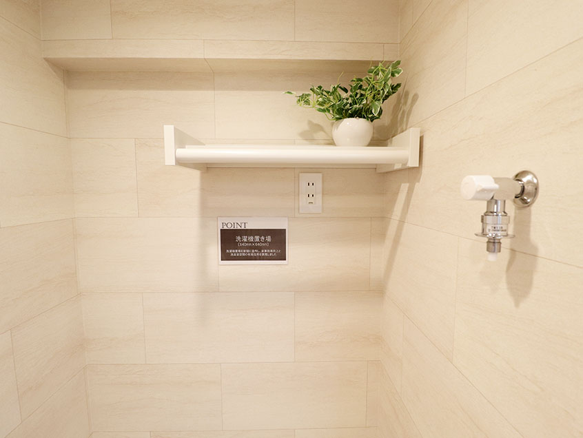洗濯機置き場の上部には多目的に使用できるラックを設置