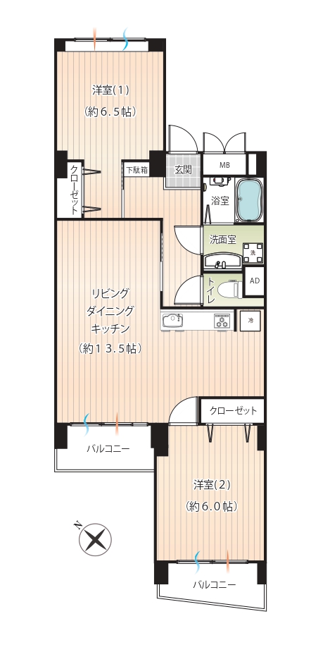 - LDK(約13.5帖)・洋室1(約6.5帖)・洋室2(約6帖)