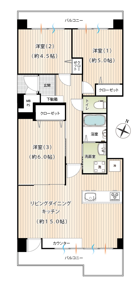 - (LDK約15.0帖、洋室1約5.0帖、洋室2約4.5帖、洋室3約6.0帖)
