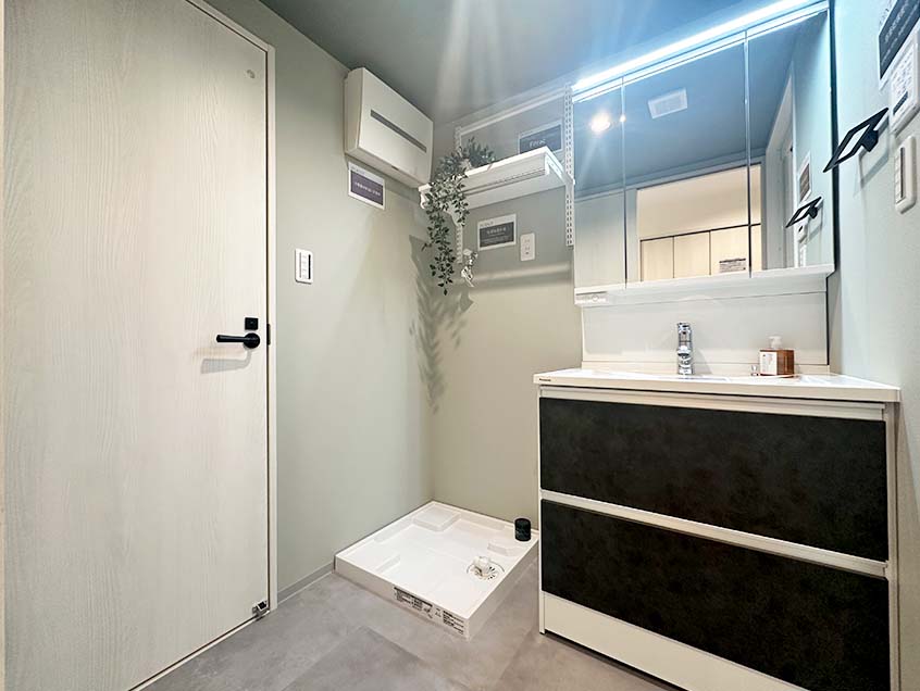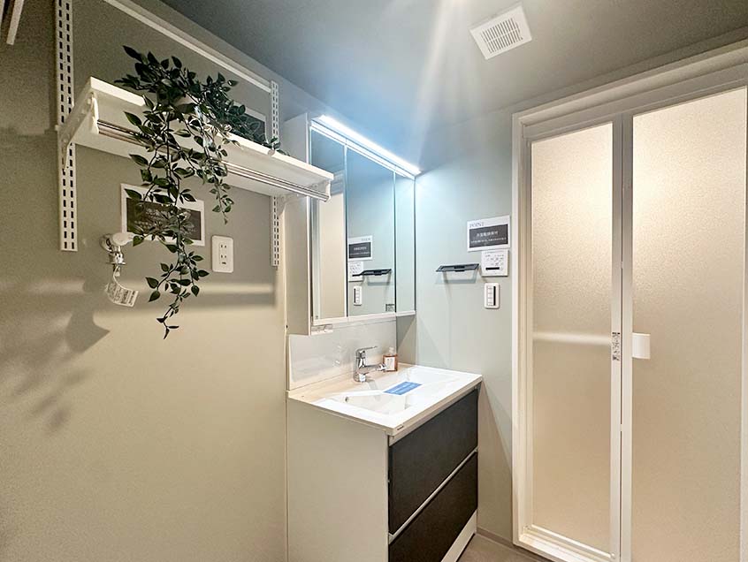 裏面収納がある三面鏡、シャワー水栓付きの洗面台