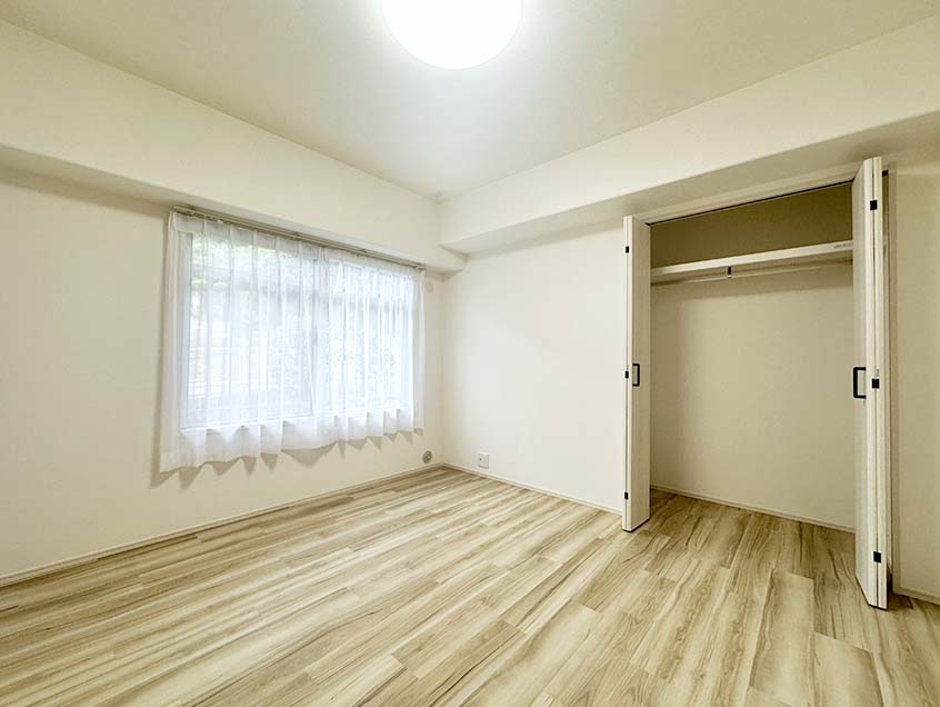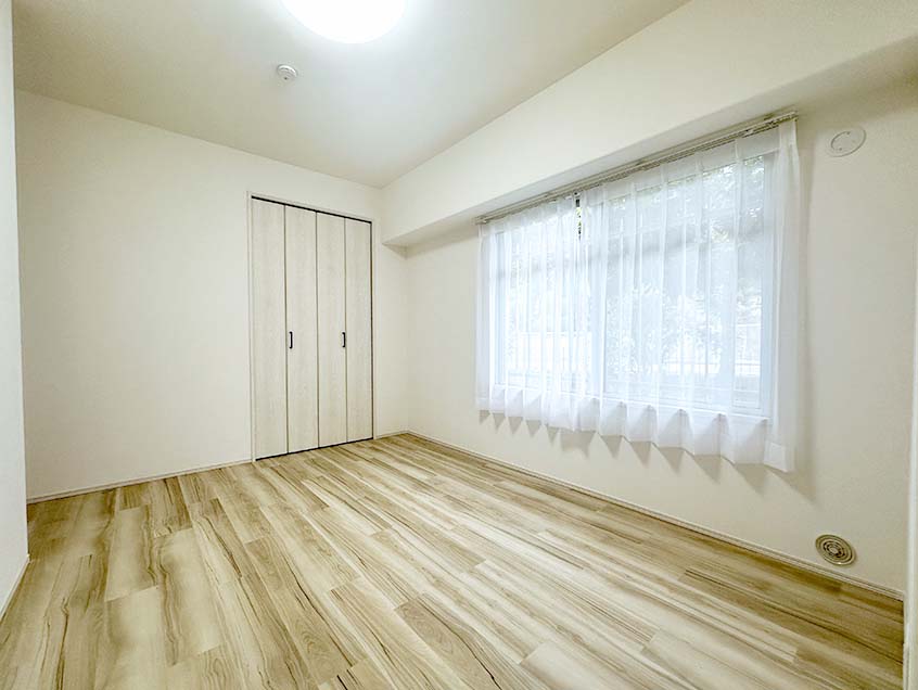 約6帖の洋室1、大きな窓から明るい光が差し込みます
