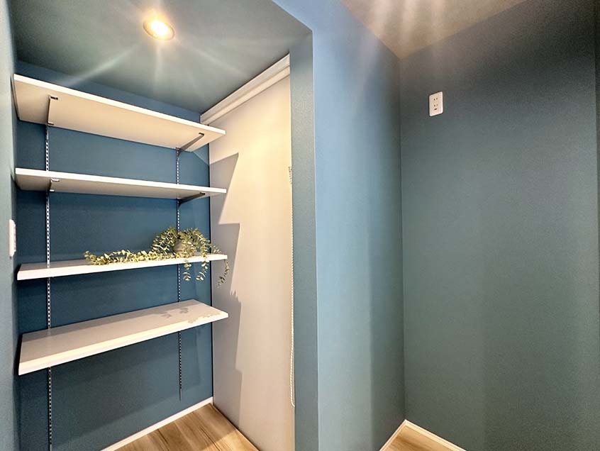 洗濯機置き場の上には高さを調節できる多目的ラックを設置