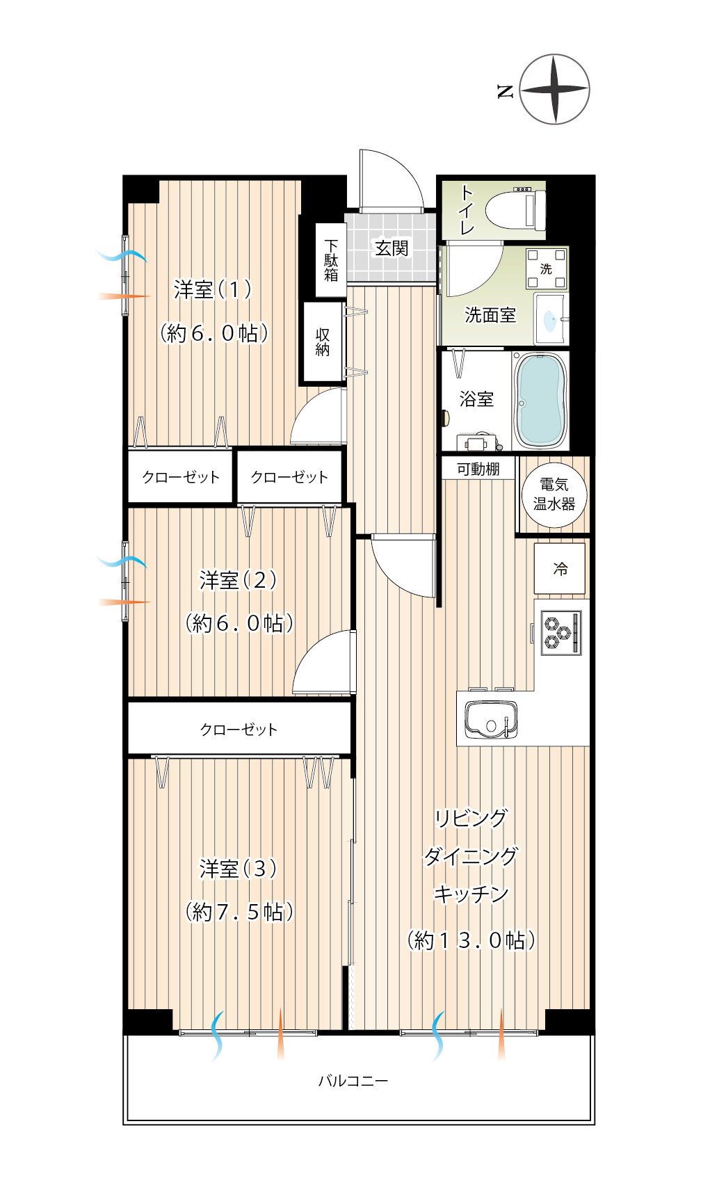 - LDK(約13帖)・洋室1(約6帖)・洋室2(約6帖)・洋室3(約7.5帖)