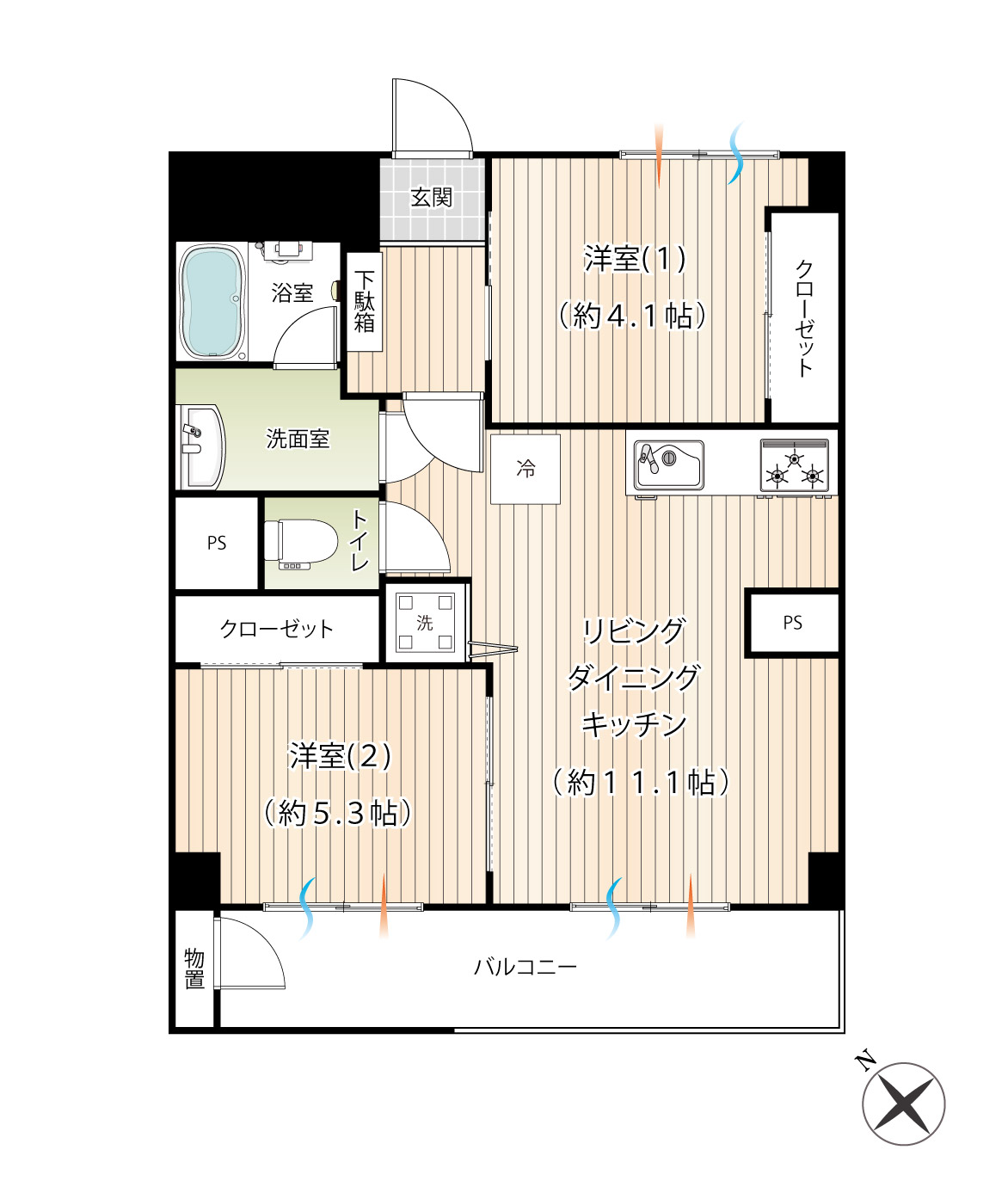 - LDK約11.1帖、洋室1約4.1帖、洋室2約5.3帖