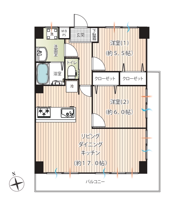 - LDK(約17帖)・洋室1(約5.5帖)・洋室2(約6帖)