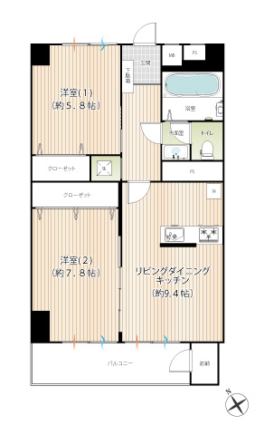 - LDK(約9.4帖)・洋室1 (約5.8帖)・洋室2 (約7.8帖)
