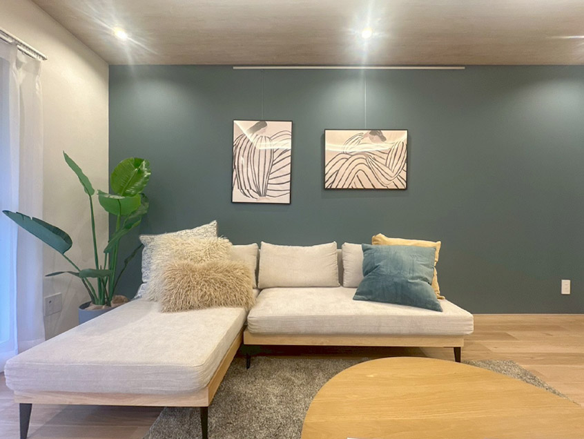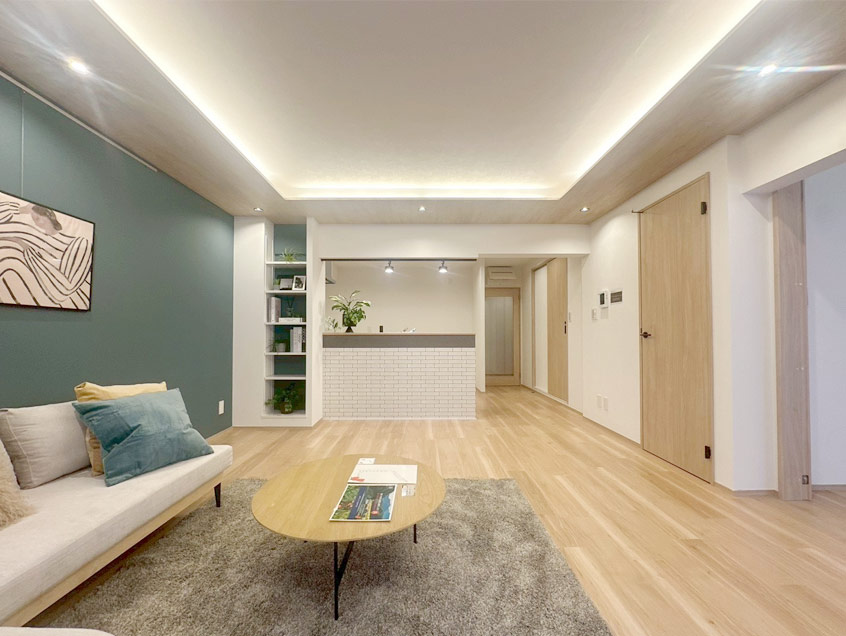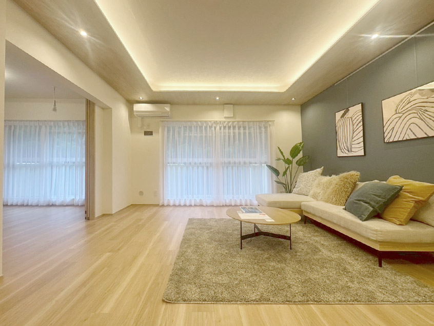 天井の間接照明が奥行を与え、広々とした空間のLDK