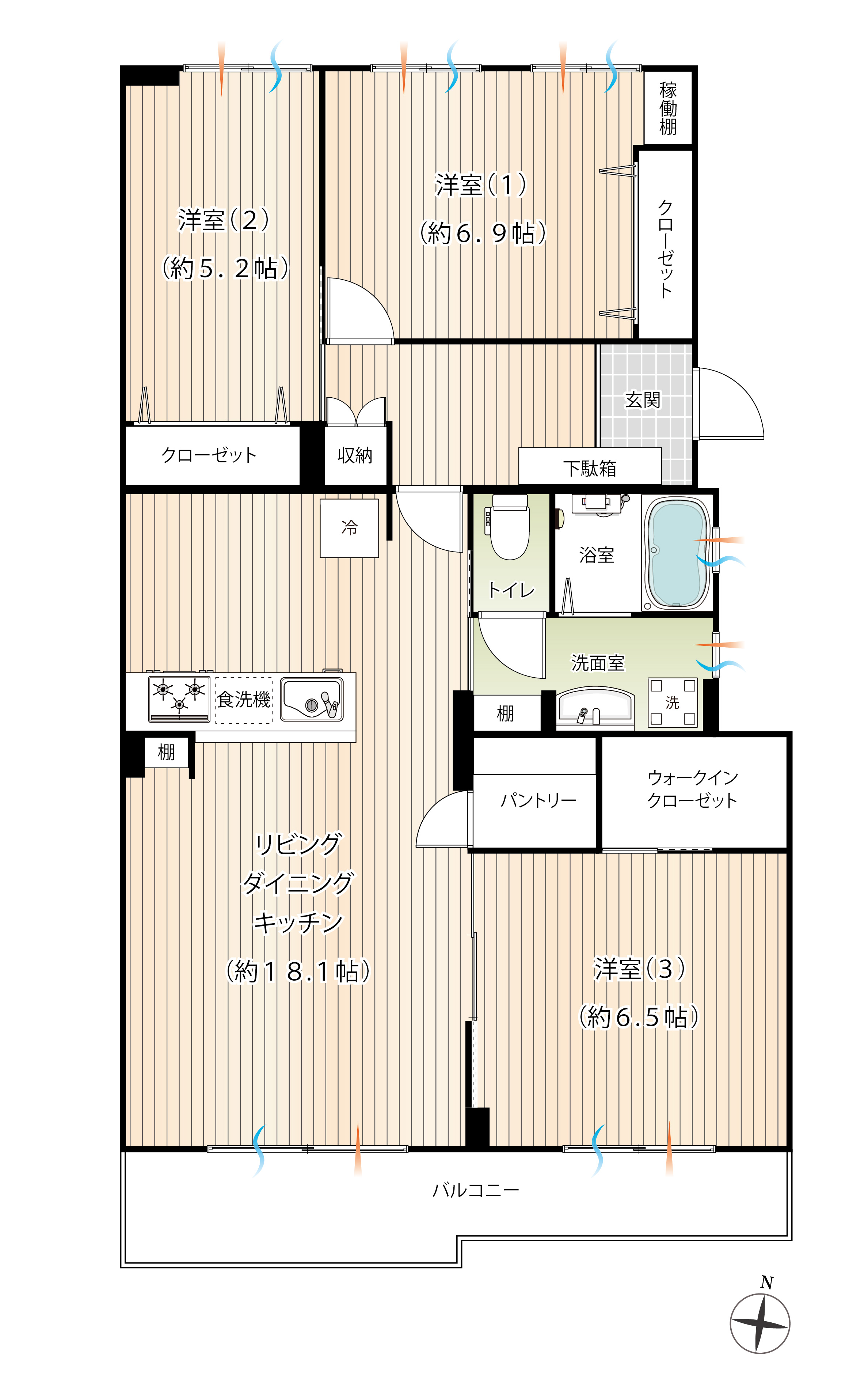 - LDK約18.1帖、洋室1約6.9、洋室2約5.2帖、洋室3約6.5帖