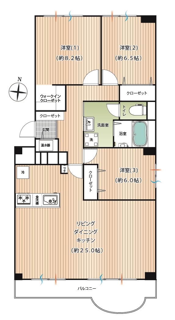 - LDK(約25.0帖)、洋室1(約8.2帖)、洋室2(約6.5帖)、洋室3(約6.0帖)