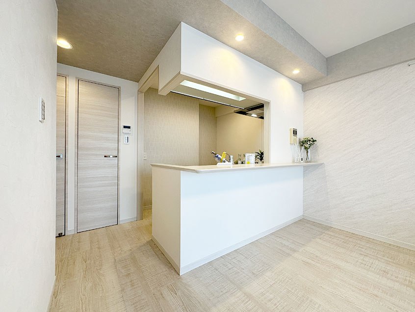 空間をほどよく仕切るセミオープンの対面式カウンターキッチンです
