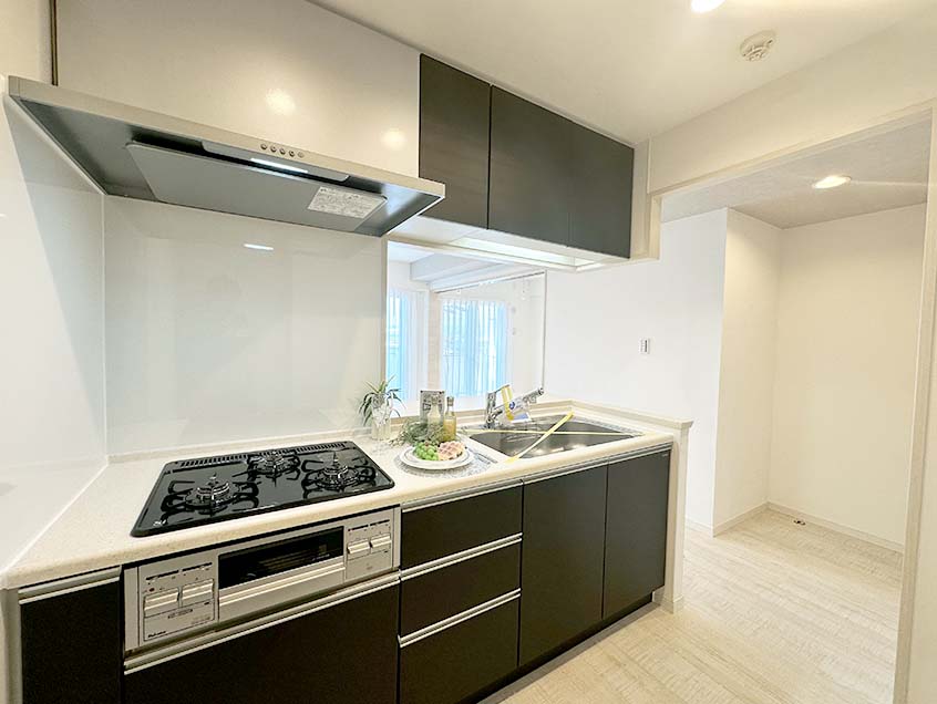 三つ口コンロ、浄水器付き水栓を備えたキッチン