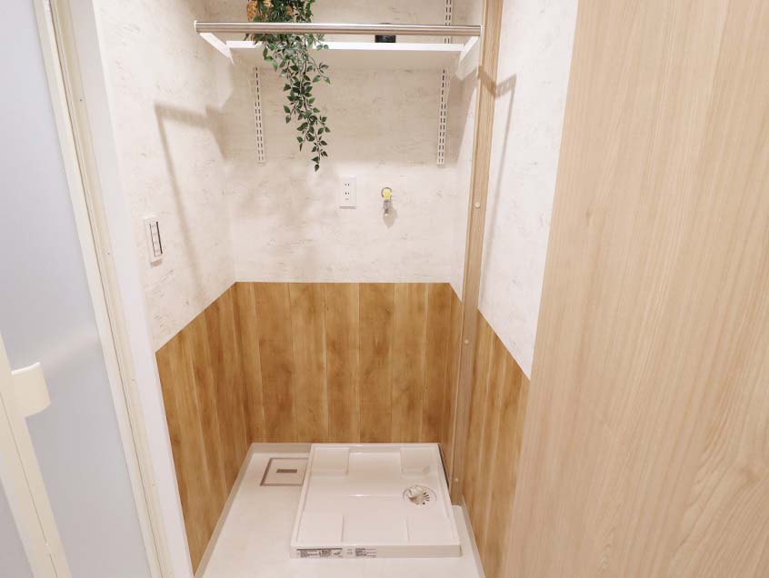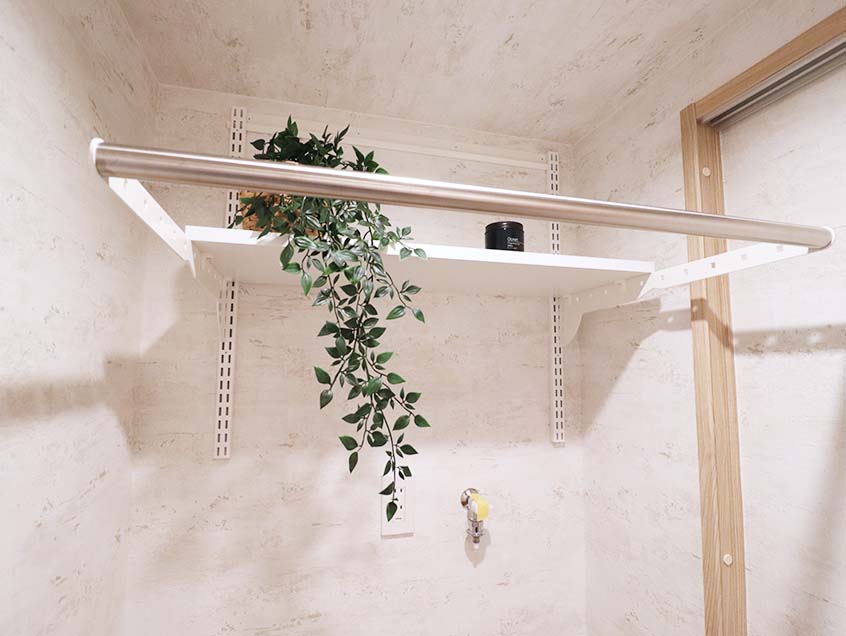 洗濯機置き場の上部には便利な多目的ラックを設置しました