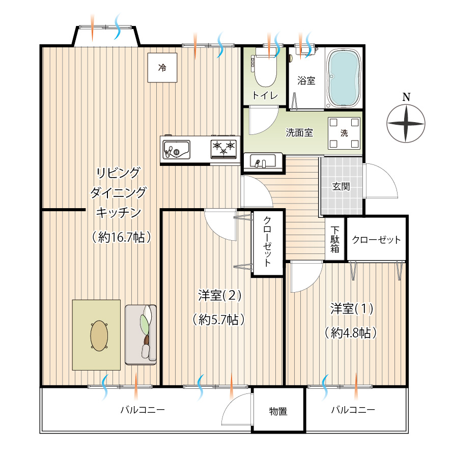 - LDK(約16.7帖)・洋室1(約4.8帖)・洋室2(約5.7帖)