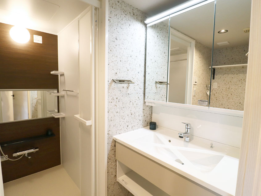スタイリッシュで使いやすいLED三面鏡付き洗面スペース