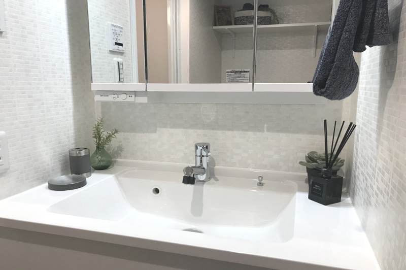 収納力のある三面鏡の洗面化粧台に新規交換