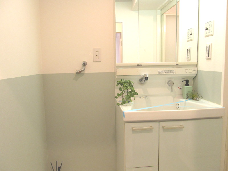 爽やかな色合いの腰壁にしたパウダールーム