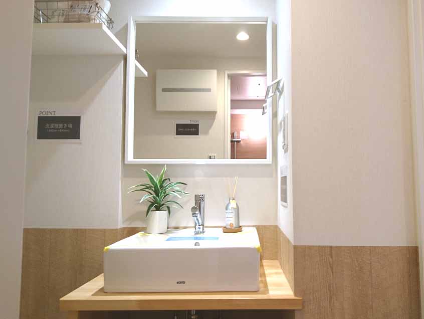 ウォールステッカーや、スクエアのタイル調クロスなど遊び心のあるデザインとなっています。