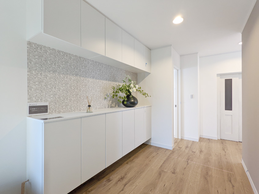 広々とゆとりのある玄関は大容量のシューズボックスを造作