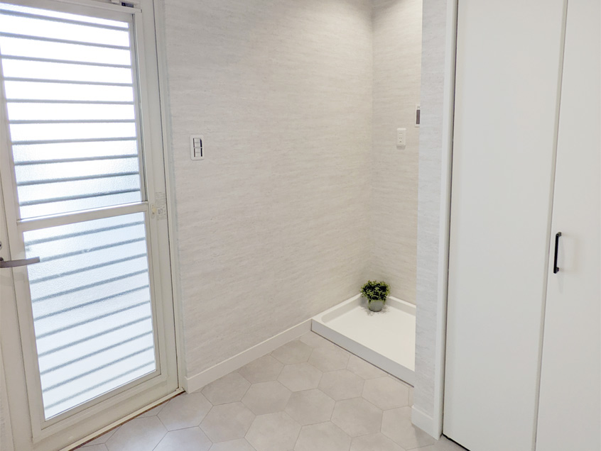 おしゃれな六角形のフロアタイルが印象的な脱衣所です