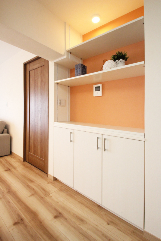 大型の収納BOX付き。可動式の棚を造作し、収納力をUP!