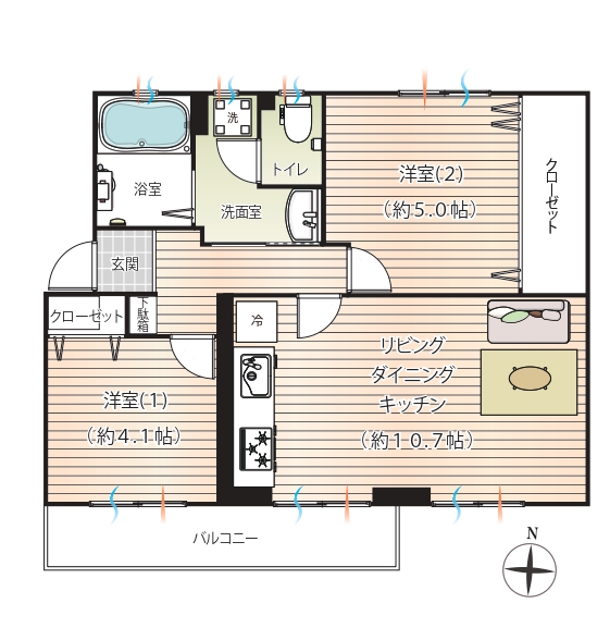 - LDK(約10.7帖)洋室1(約4.1帖)洋室2(約5.0帖)