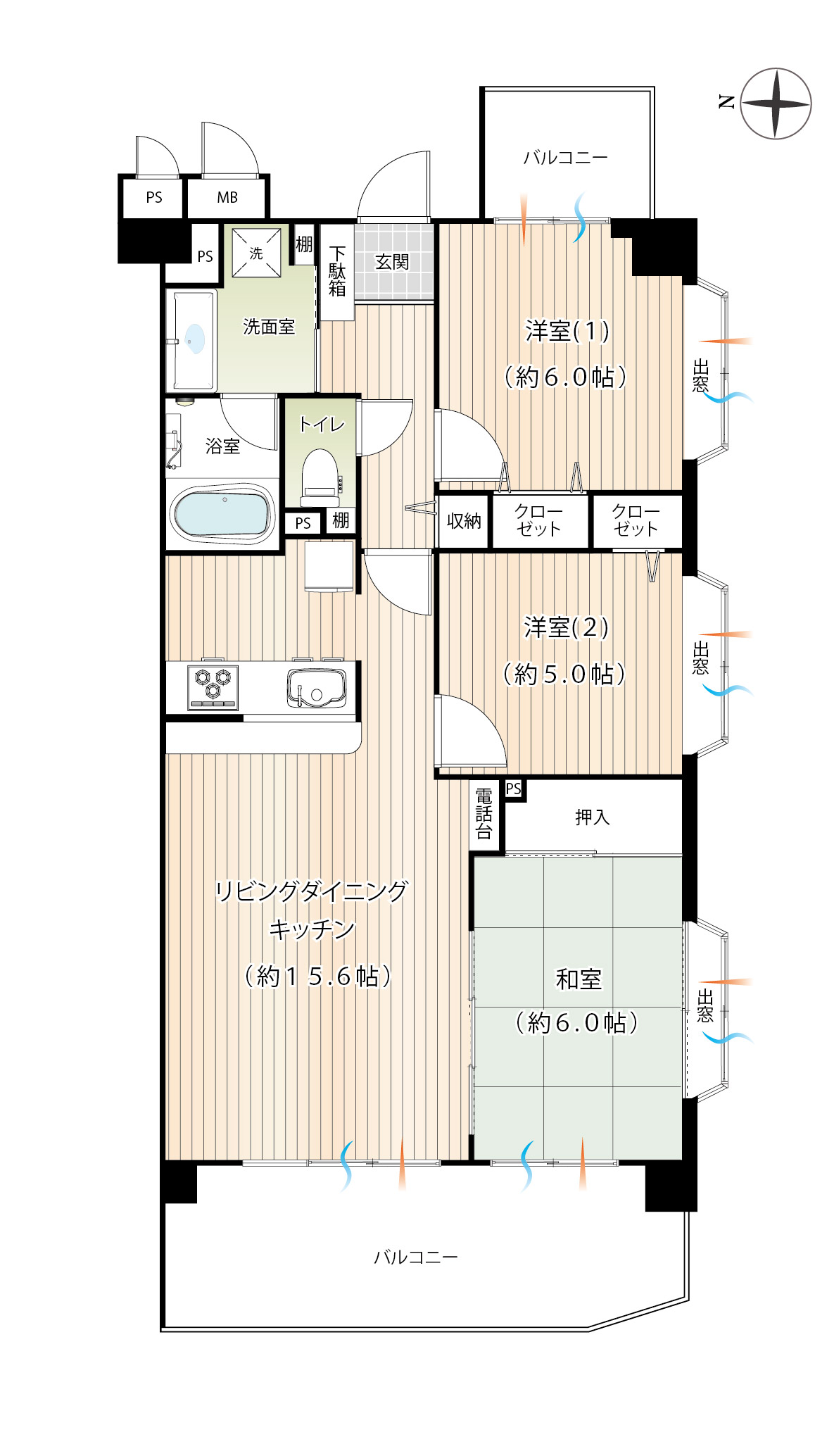 - LDK(約12.6帖)洋室1(約6.0帖)洋室2(約5.0帖)和室(約6.0帖)