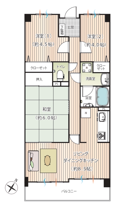 - LDK(約8.5帖)洋室1(約4.5帖)洋室2(約4帖)和室(約6帖)