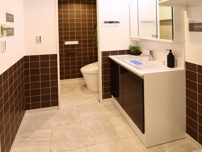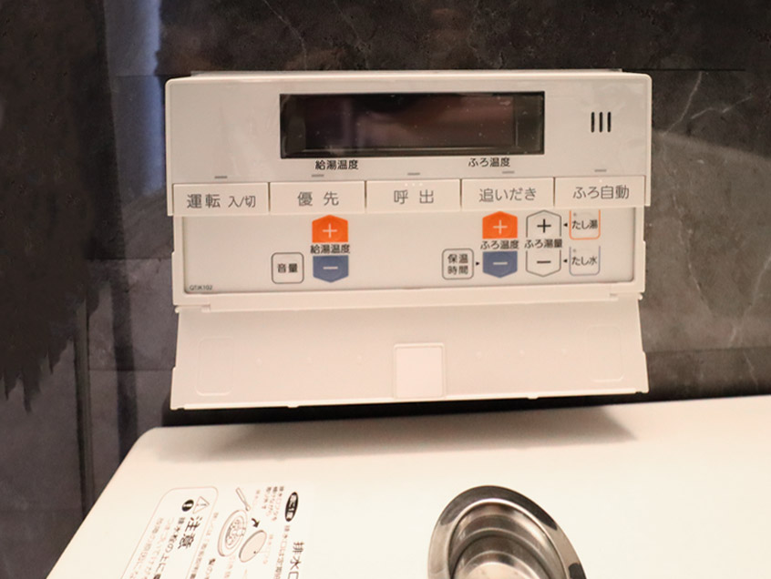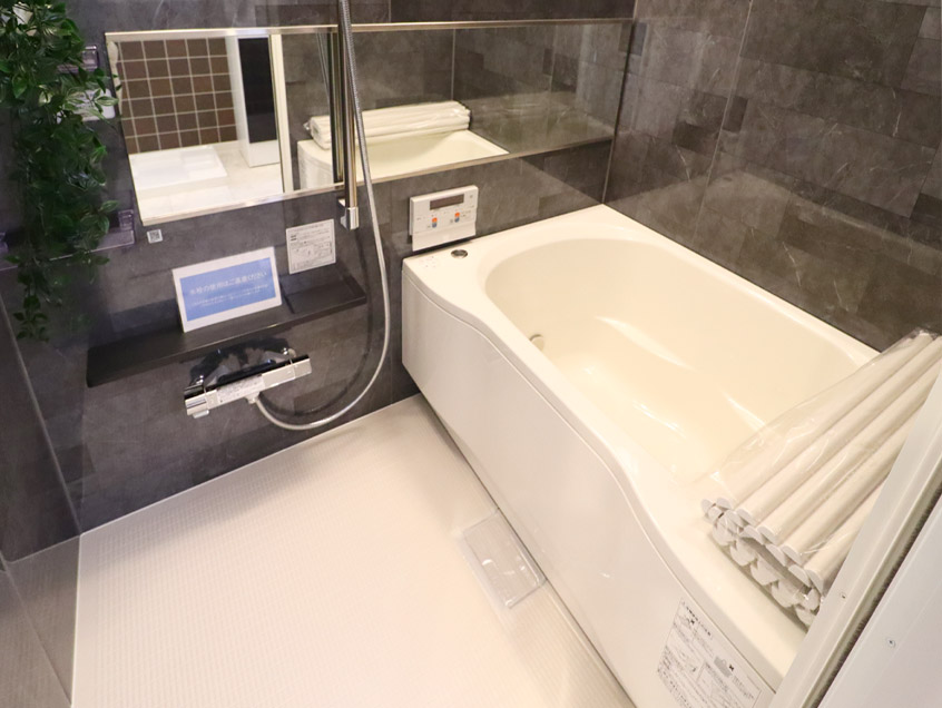 大理石調パネルが落着きのある雰囲気のバスルーム