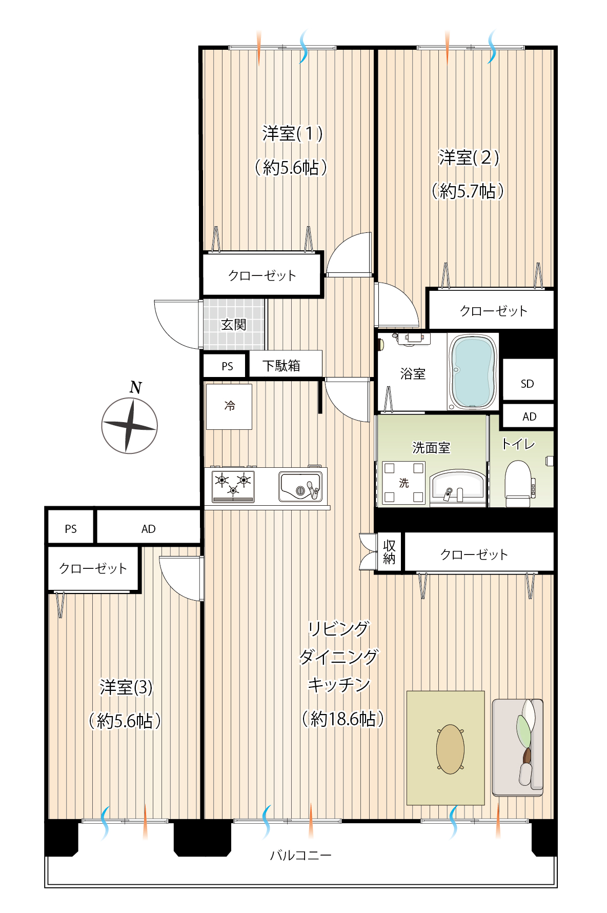 - LDK約18.6帖、洋室1約5.6帖、洋室2約5.7帖、洋室3約5.6帖