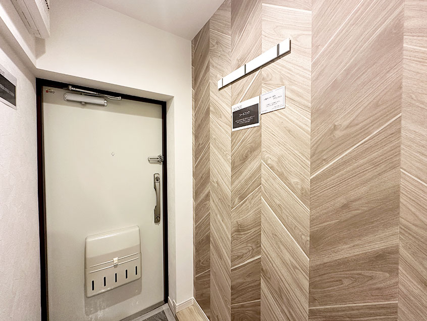 ヘリンボーン柄クロスがおしゃれな玄関、コートフック付き