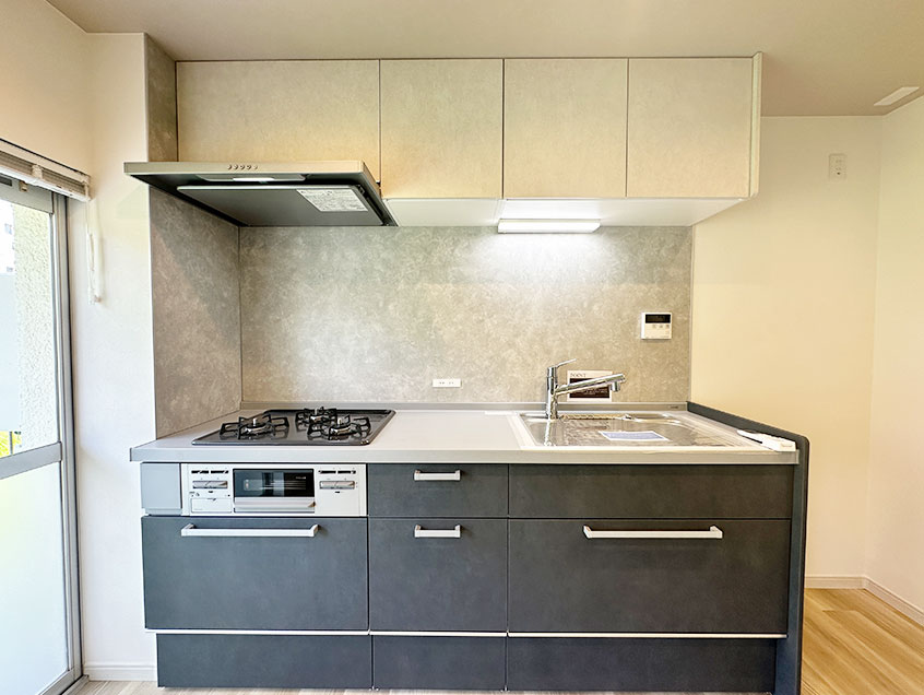 3つ口コンロ、浄水器付き水栓完備のシステムキッチン