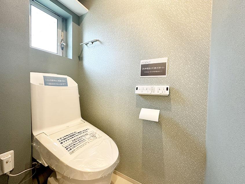 すっきりフォルムの一体型トイレ、換気ができる窓付き