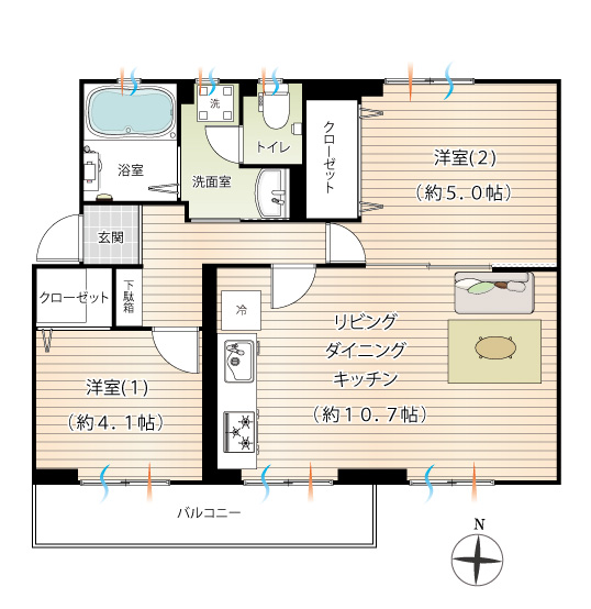 - LDK(約10.7帖)・洋室1(約4.1帖)・洋室2(約5.0帖)