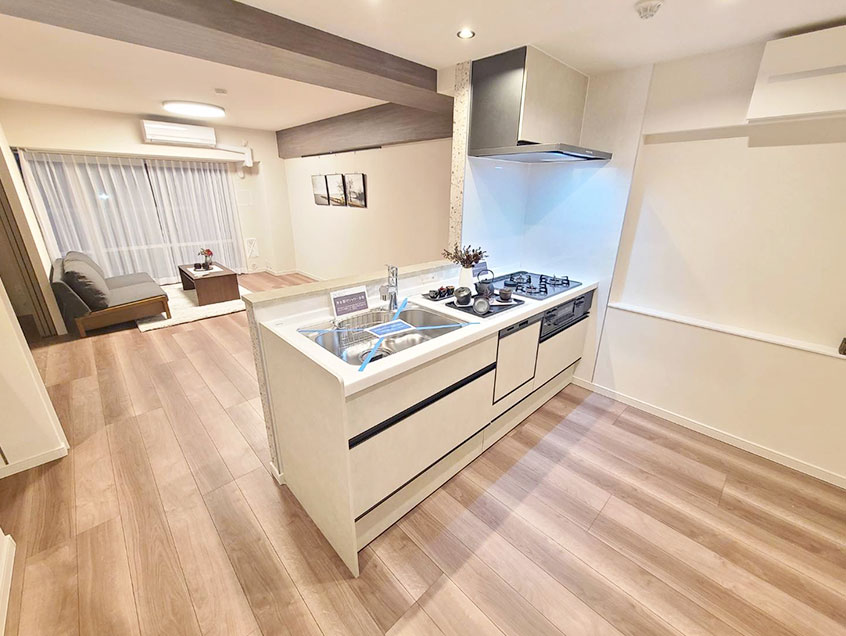 食洗機や三つ口コンロ、浄水器付き水栓を完備したキッチンです