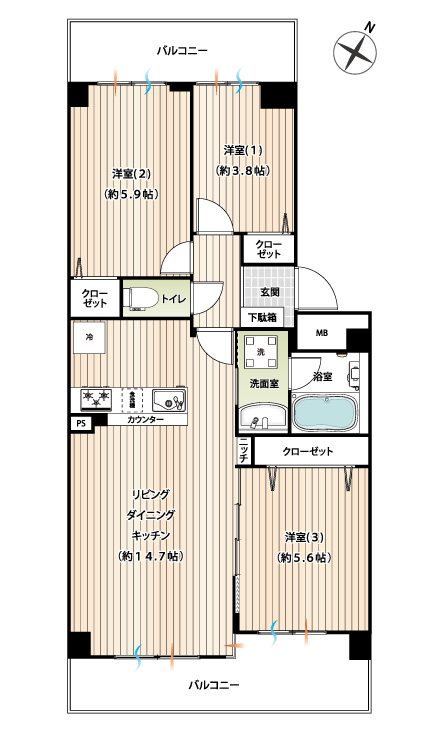- LDK(約14.7帖)・洋室1(約3.8帖)・洋室2(約5.9帖)・洋室3(約5.6帖)