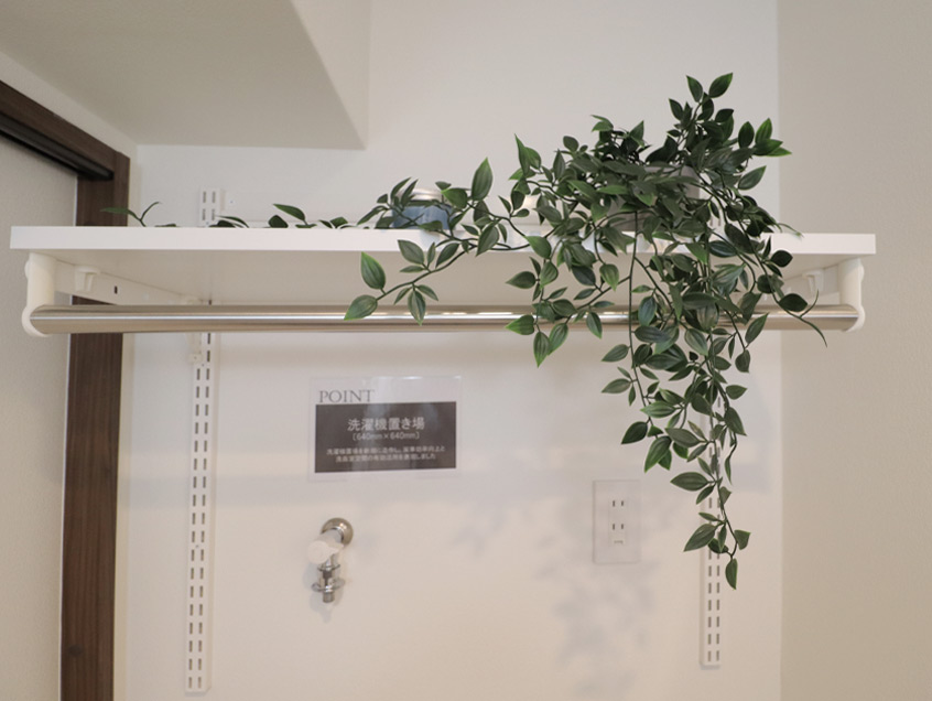 洗濯機置き場の上部には便利なハンガーポールがあります