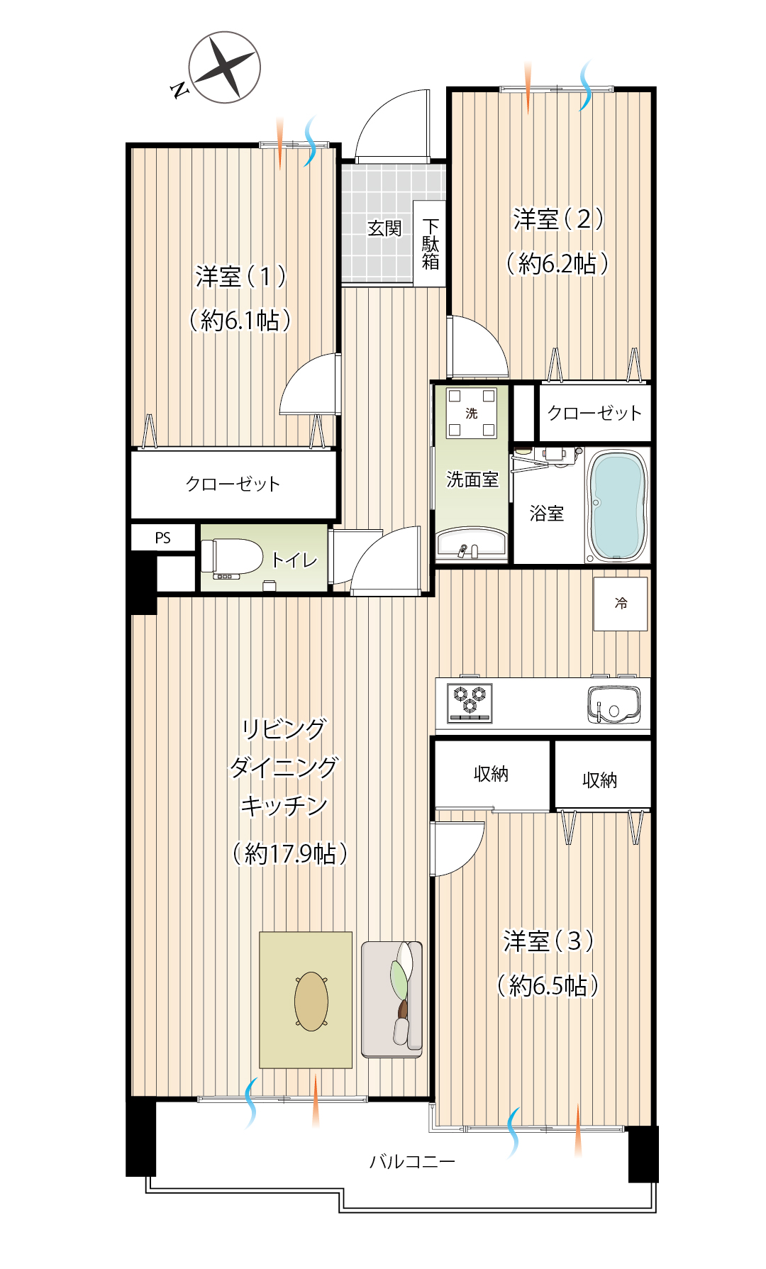 - LDK(約17.9帖)洋室1(約6.1帖)洋室2(約6.2帖)洋室3(約6.5帖)