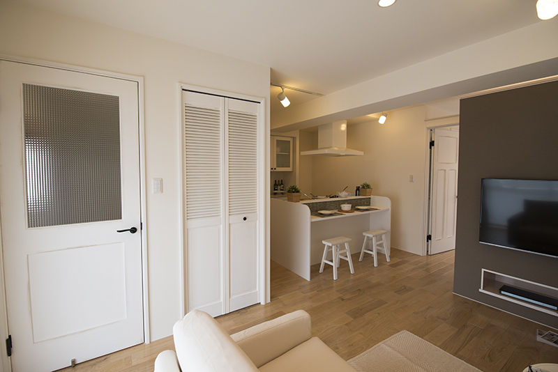 築44年のマンションで北向きで間仕切りが多いため、部屋の中が暗いイメージになってしまう。使い勝手の良い設備にして、明るい内装で友人を呼んでホームパティを開きたい。
