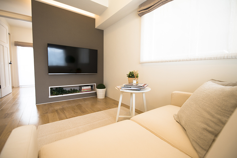 リビング2 afterシングルのお客さまのため、お1人の時間を楽しめる事も重要です。一方でホームパーティーを開催できる場所とするため、効率的な導線設計を行いつつ、広い空間設計も必要です。そのため、大型の液晶テレビを壁掛け式にして、機器の配線を隠すことですっきりとした空間に仕上げました。