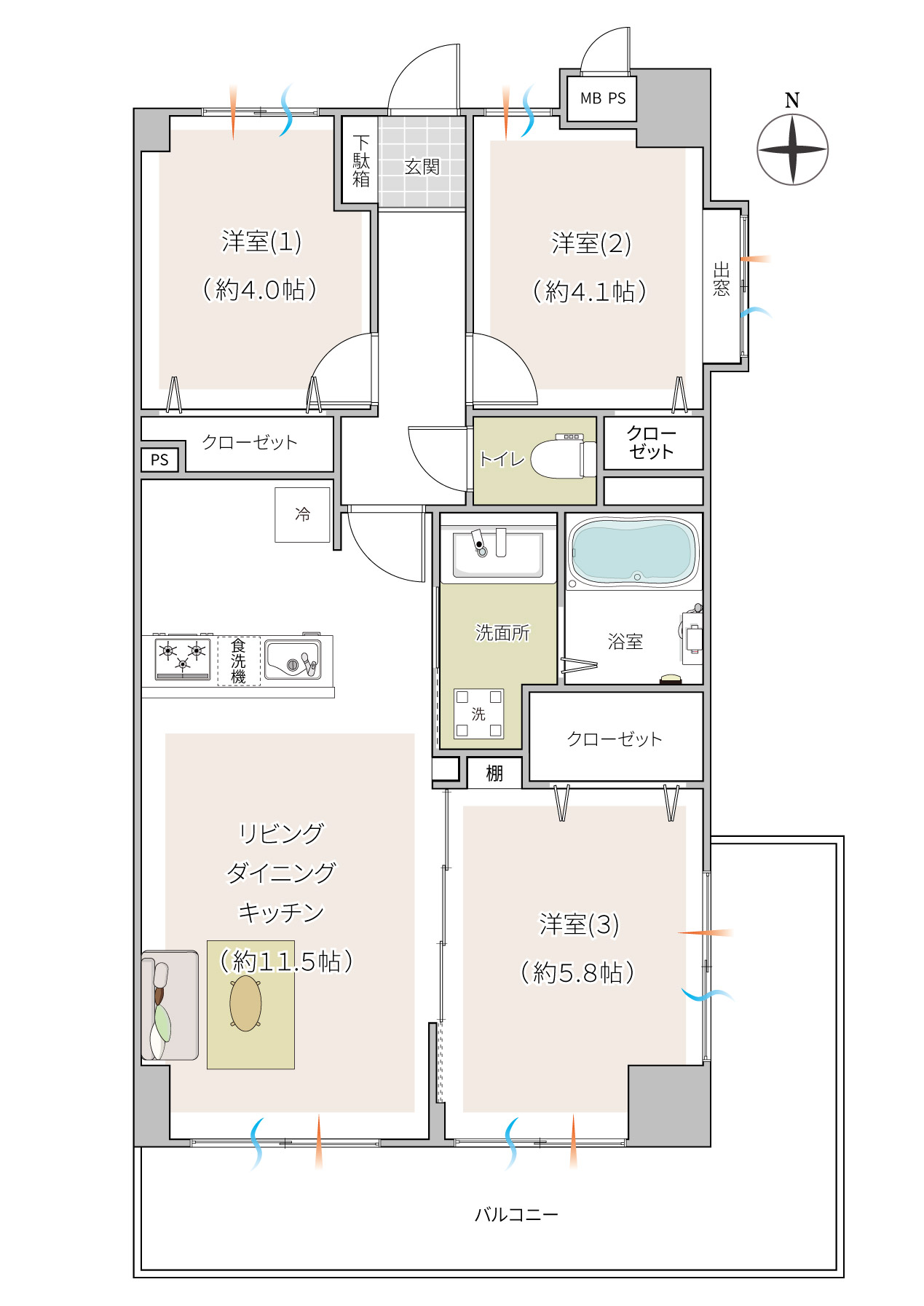 | 間取り詳細 | LDK約11.5帖、洋室1約4.0帖、洋室2約4.1帖、洋室3約5.8帖 |