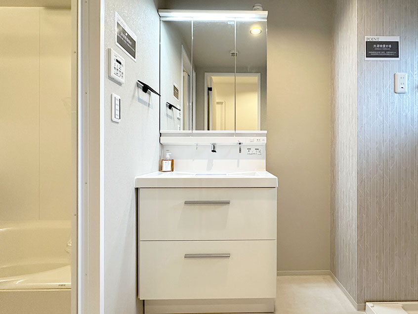 裏面収納付きの三面鏡と、シャワー水栓を備えた洗面台です