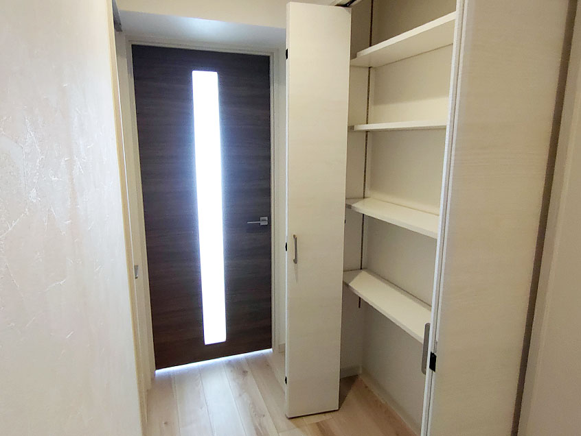 廊下にも便利な可動棚が付いた収納スペースがあります