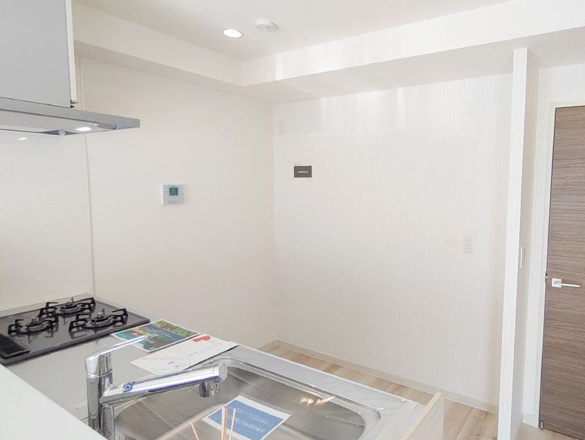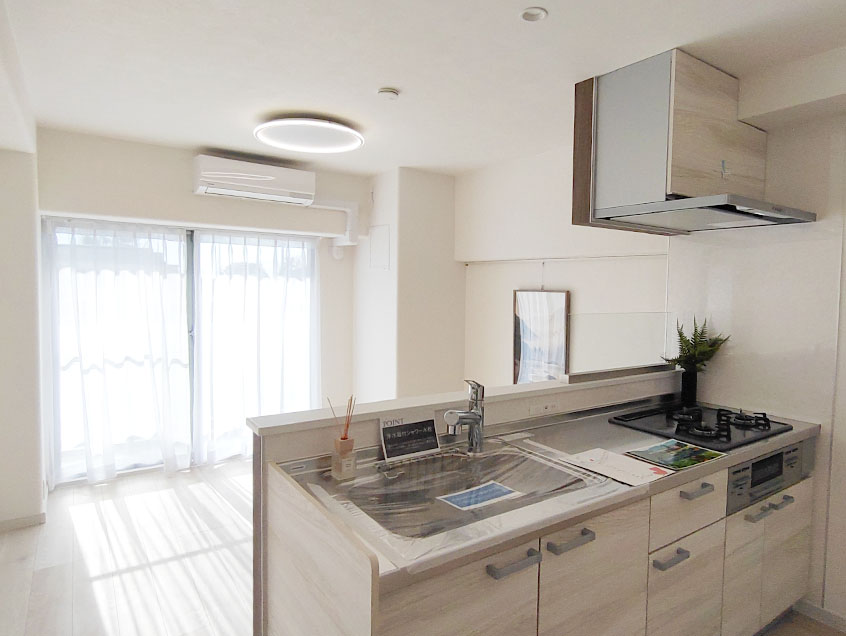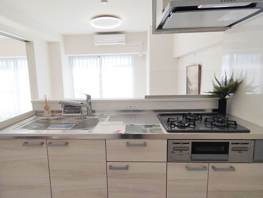 ■浄水器付き水栓や三つ口コンロを備えた対面式キッチン