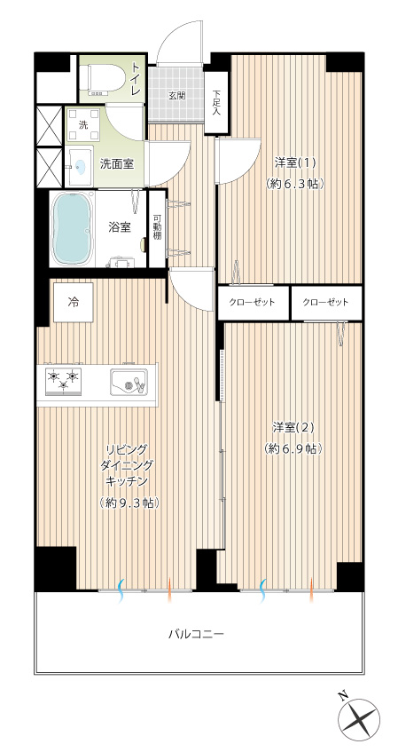 - LDK(約9.3帖)・洋室1(約6.3帖)・洋室2(約6.9帖)