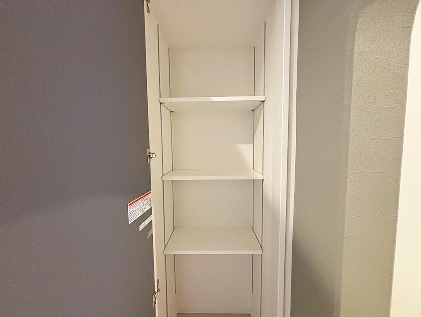 廊下には奥行きのある可動棚付きの収納スペースがあります