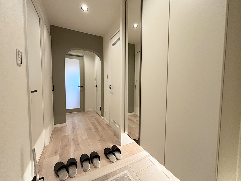 おしゃれなアーチ壁が出迎えてくれる玄関