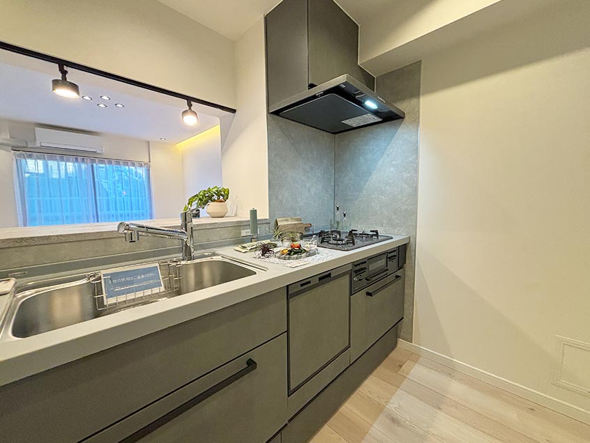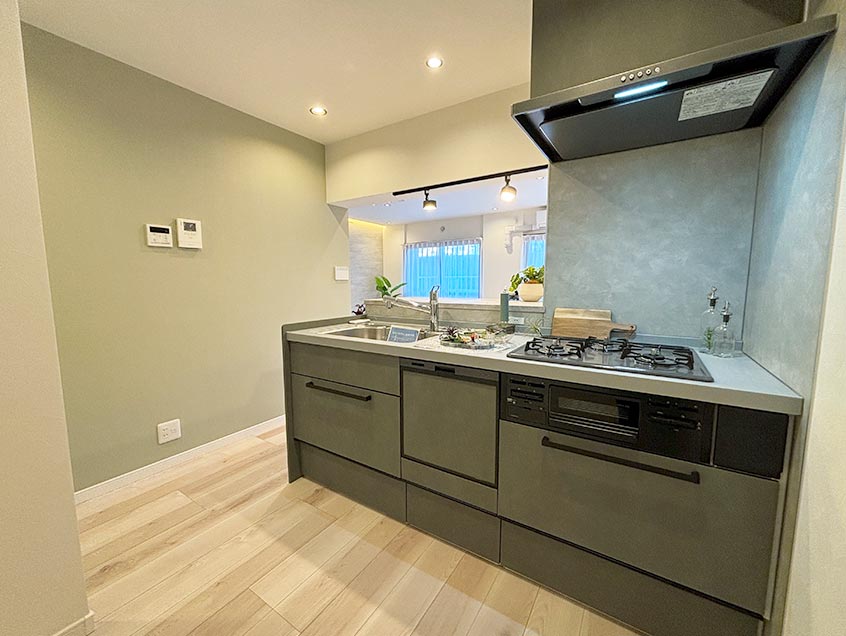 食洗機、浄水器付き水栓、三つ口コンロを備えたキッチン